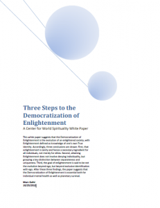 This white paper, “Three Steps to the Democratization of Enlightenment,” by Marc Gafni suggests that the Democratization of Enlightenment is the evolution of an enlightened society, with Enlightenment defined as knowledge of one’s own True Identity. Accordingly, three conclusions are drawn: First, that enlightenment is sanity and hence a necessary ingredient for all individuals, not merely for elites. Second, attaining Enlightenment does not involve denying individuality, but grasping a key distinction between separateness and uniqueness. Third, the goal of enlightenment is said to be not the evolution beyond ego, but beyond exclusive identification with ego. After these three findings, the Marc Gafi suggests that the Democratization of Enlightenment is essential both for individual mental health as well as planetary survival.